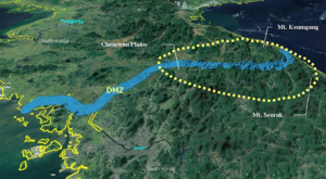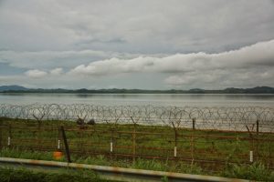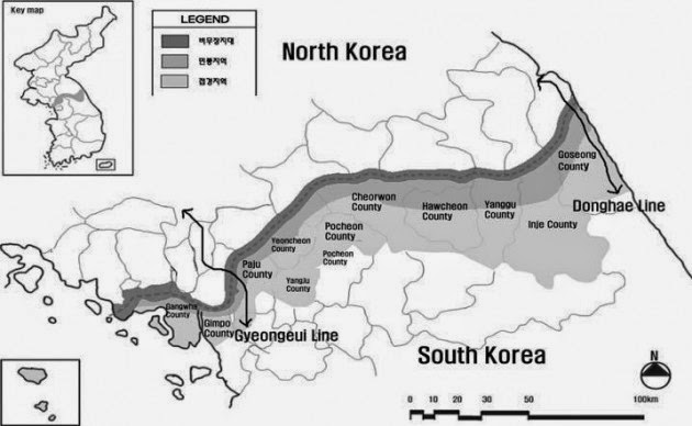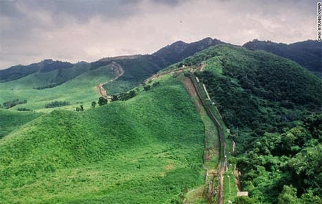 Now it’s not managed as a park, for obvious reasons. It can be assumed that the soldiers, North, South, American, thousands of them concentrated here you must realize, clear their fields of fire, and they patrol pretty constantly. There is a fence from what I know that runs the length of the actual middle line, but despite all that, there is a green strip visible on satellite running from the Han River to the Sea Of Japan coast over the mountains to the east.