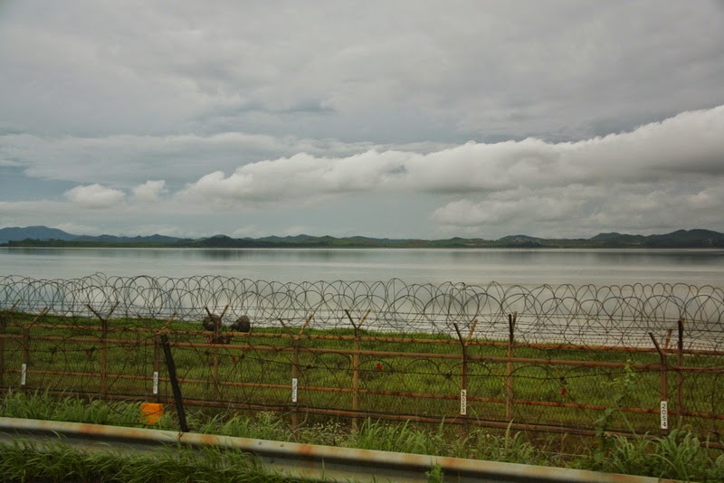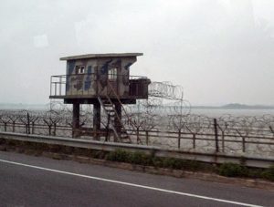 The Imjin is the major river that runs along the Western DMZ from up into North Korea at it’s headwaters. It divides the two countries for about a quarter of the border, and joins the mighty Han, the river of Seoul, downstream from Seoul to flush into the Yellow Sea near the now famous Inchon. The soldiers are a genial bunch, and the one who speaks English, a recruit Corporal or Sergeant ( I can’t totally tell their ranks), still in his required time but doing well, is quite smart. He had spent two years in college in the US before returning home for his military obligation, and his almost accent-less English is fluid and disarming. They are all modern children of Korea, grew up with conveniences and a good education, movies, music, phones and books, but they are soldiers, and you can tell they can be tough underneath by the standards of modern teens. It becomes clear that my little quest might end here. The bridge, where my friend has described his base being about a half mile across, is what is called the Civilian Line of Control, and without a permit, not hard to obtain, or without being a farmer working in there, I can’t go any further… they couldn’t be nicer in explaining this, and submit to me asking questions about the area and telling me stories.. it’s morning on guard duty, and there don’t appear to be any North Korean hordes coming anytime in the next half hour. it’s not on the daily bulletin anyhow… our conversation is broken by bouts of patriotic music, and a group of former comrades in arms who come up to say hi to their old unit, now just an hour away from their cushy modern life in Seoul. it’s fun, and I can see they care about their work and each other. As I speak with them, watching the bridge, and the river, and the wild bluffs on the other side, I see waterfowl and wonder about clams on the bottom of the river. it looks like the Hudson in late fall, or a smaller river, the Housatonic, or any number of Appalachian Rivers, and it feels strangely peaceful despite the North Korean presence hanging 3 or 4 kilometers north of us like a Damocles Sword.